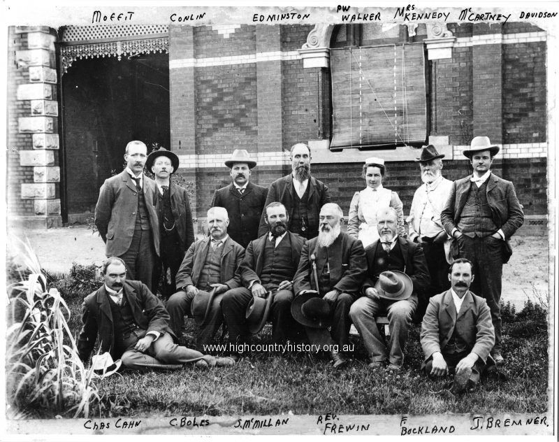 1900 – Old hospital – Hospital Committee. Back row: (?) Moffit (Bank of NSW), H. Conlan (Delatite Hotel), J. Edmanson (National Bank), P.W. Walker (Store), Miss S. Kennedy (Matron), E. McCartney, A. G. Davidson (Solicitor). Front row: C.H. Cahn (store), C. Boles (Saddler), S. McMillan (Blacksmith), Rev J.F. Frewin (Church of England), F.J. Buckland (Stock and Station Agent), J.R. Bremner (Mansfield Hotel).