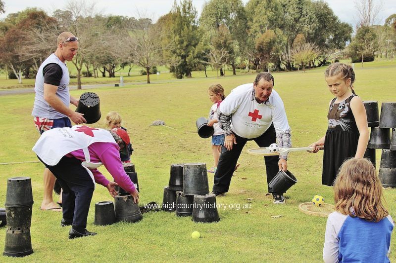 Kay & Peter Tie (Red Cross Deputy President) organizing Children’s Games at the Red Cross Dedication of the Mansfield Branch & 100 Years of Red Cross in Australia and Picnic Day, at the Mansfield Botanic Park, 14th September, 2014.