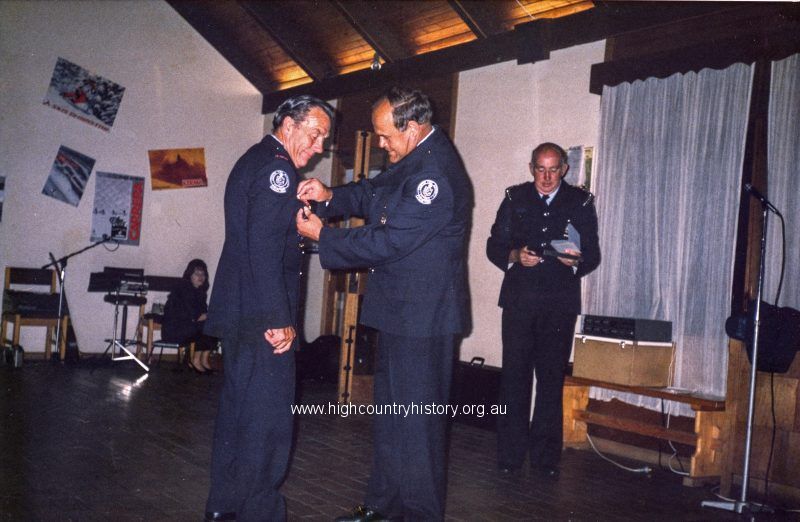 Mansfield Fire Brigade, Captain Neville Mathieson presenting Gordon McMillan with his Long Service medal, which Johnny Marks is pinning in place, at the Mansfield BP Roadhouse.