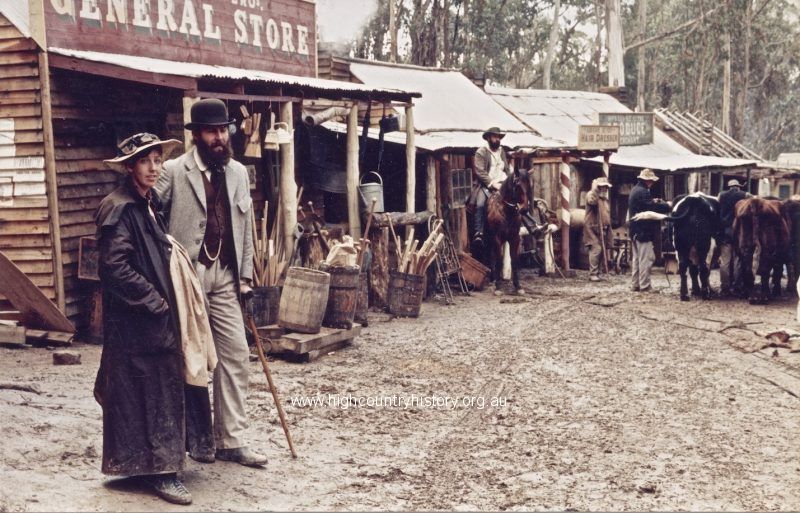 4324 – Trading stores at Eureka Creek, Merrijig, the site built for the filming of the ‘The Man from Snowy River II’ – general store, hairdresser and produce store. 4324a – General store and unfinished church. 4324b. Unfinished church, general store, hairdresser, produce store. Far left John Howier (SES) and bullocky.