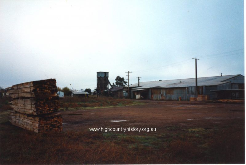 Ashfield Sawmill, 1996. The whole length of the building which housed the mill, from breaking-down saw to sorting table, part of which is visible to the right. The three stacks of timber to the left would have been built at the sorting table and will be racked for air-drying.