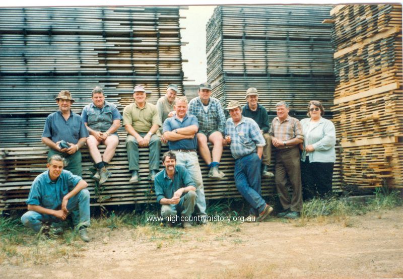 Ashfield Mill, 1996. Seated on rack (these are the completed air-dried racks): Robert Skipper, Peter Martin, Ken Steers, Shane Foots, Greg Warhurst. Leaning on rack: Bill Ward, Brian Davies, Adrian Lewis, Bob Jones. Kneeling: Scott Fewster, Ivan Campbell.