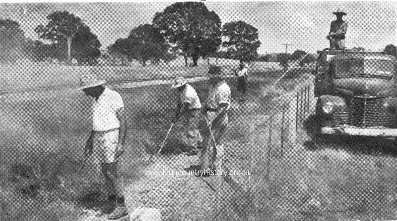 Burning off along the railway. Caption with photograph “Protected by a firebreak made by this track force inside the railway boundary fence, grass burning-off is carefully carried out between Mansfield and Maindample, VIC. The Victorian Country Fire Authority has frequently expressed, in public, entire satisfaction with the work of the V.R. in minimising fire risks in the hot, summer months.”