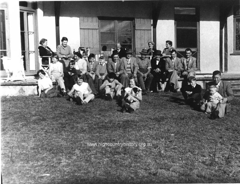Chater family at Coldstream Hill. Gardner’s house. Two of Peter Gardner’s sisters rode from Howqua to Lilydale to Coldstream Hill with Fred Fry. Back row left to right: Minnie the goat, Emily (Millie Fry, Bob’s wife), Shirley Gardner, Tommy Leslie, Vera Bergin ( Emily’s sister), Veronica (Fry) Chater. Middle row left to right: Patricia Gardner, Bill Gardenr, Peg Fry (Plozza – Bob Fry’s daughter), Barry Chater, Graeme Chater, Fred Chater jnr, Bob Fry, Fred Fry, Steve Fry, Les Buxton, Fred Chater. Front row left to right: Unknown, Elizabeth Gardner, Unknown, Jacqueline Gardner, Robert Chater, Bill Plozza with Robert Plozza.