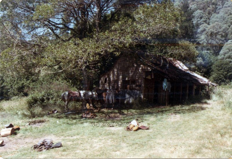 Dick Forrest and Peter Purcell, in partnership, taking cattle into Mitchells Creek for summer grazing (On the narrow Bridle Track) up the Jamieson River 1978-1980. Commentary by Dick Forrest: The old house where we used to stay Somehow it burnt down about 6 years after this photo. The Hoskins Family who loved here used to grow pigs, sheep, cattle and a large potato patch they were very friendly to visitors and there is a lot of history about them.
