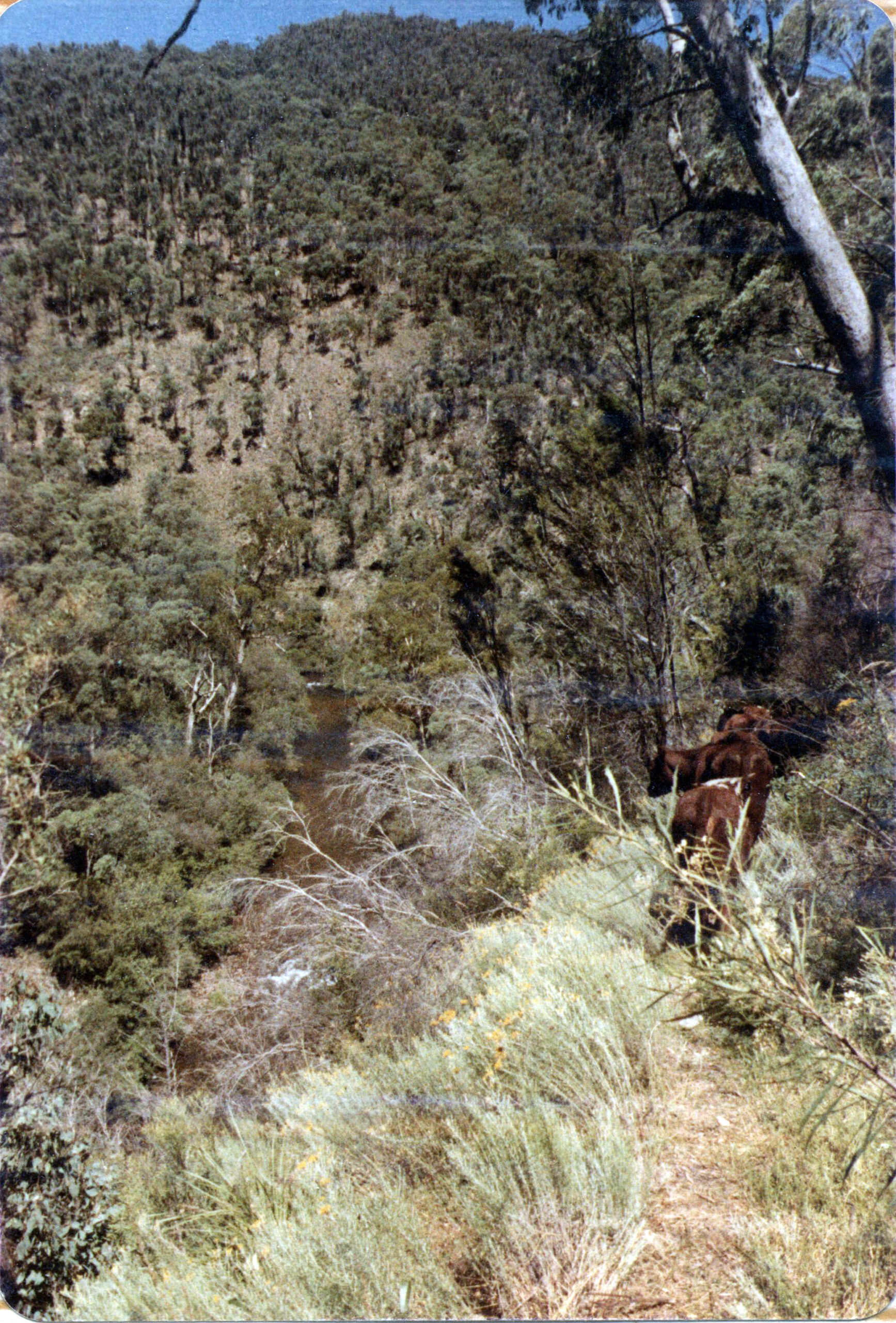 Dick Forrest and Peter Purcell, in partnership, taking cattle into Mitchells Creek for summer grazing (On the narrow Bridle Track) up the Jamieson River 1978-1980. Commentary by Dick Forrest: Cattle on Bridle track. Jamieson River below in some places there was a very steep drop down