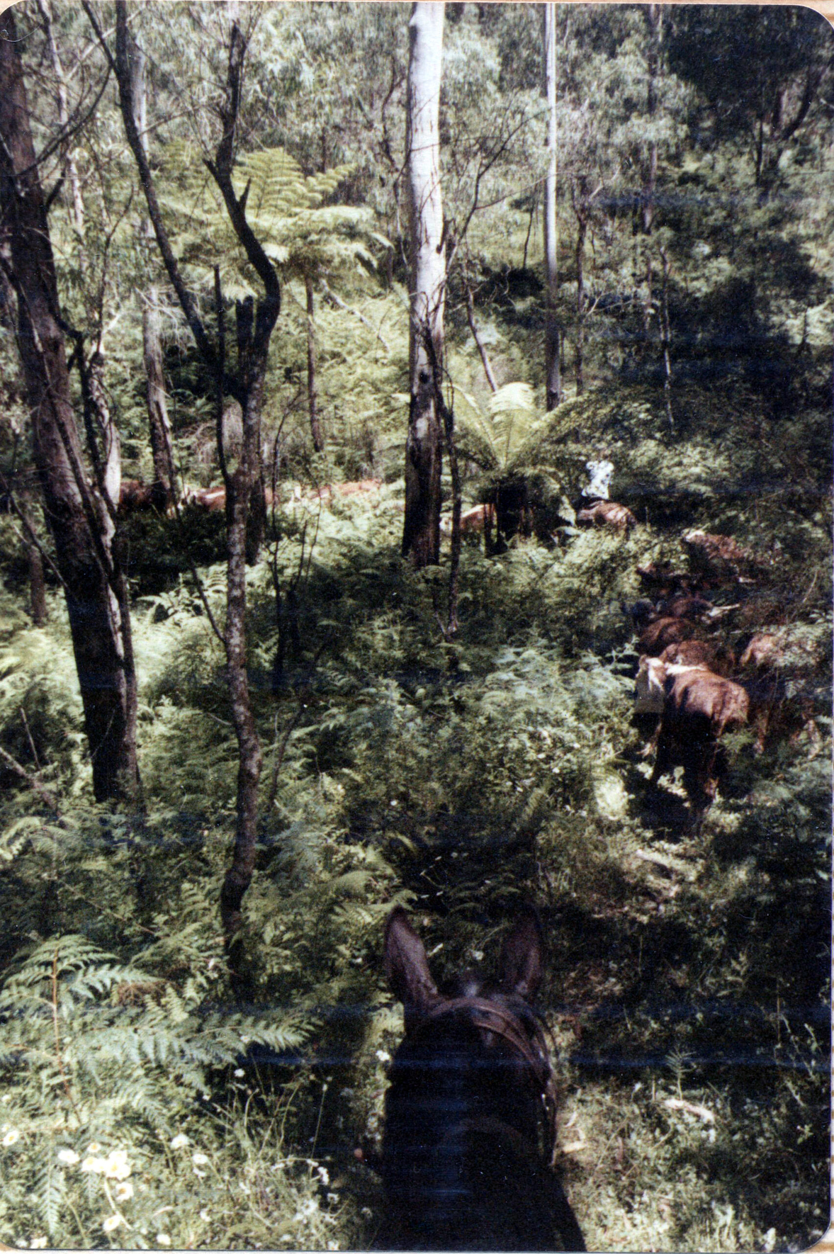 Dick Forrest and Peter Purcell, in partnership, taking cattle into Mitchells Creek for summer grazing (On the narrow Bridle Track) up the Jamieson River 1978-1980. Cattle walking through beautiful tree ferns and scrub. It is a great shame all this has Commentary by Dick Forrest: been stopped. The Government pay people to keep the bridle track open for bushwalkers. We did it for nothing. Mitchells is now a very small area of grassy plains xxx the rest is all overgrown with wattles and suckers. Deer everywhere and wild dogs last time I went in there. A spectacular place ruined by not being used for grazing.