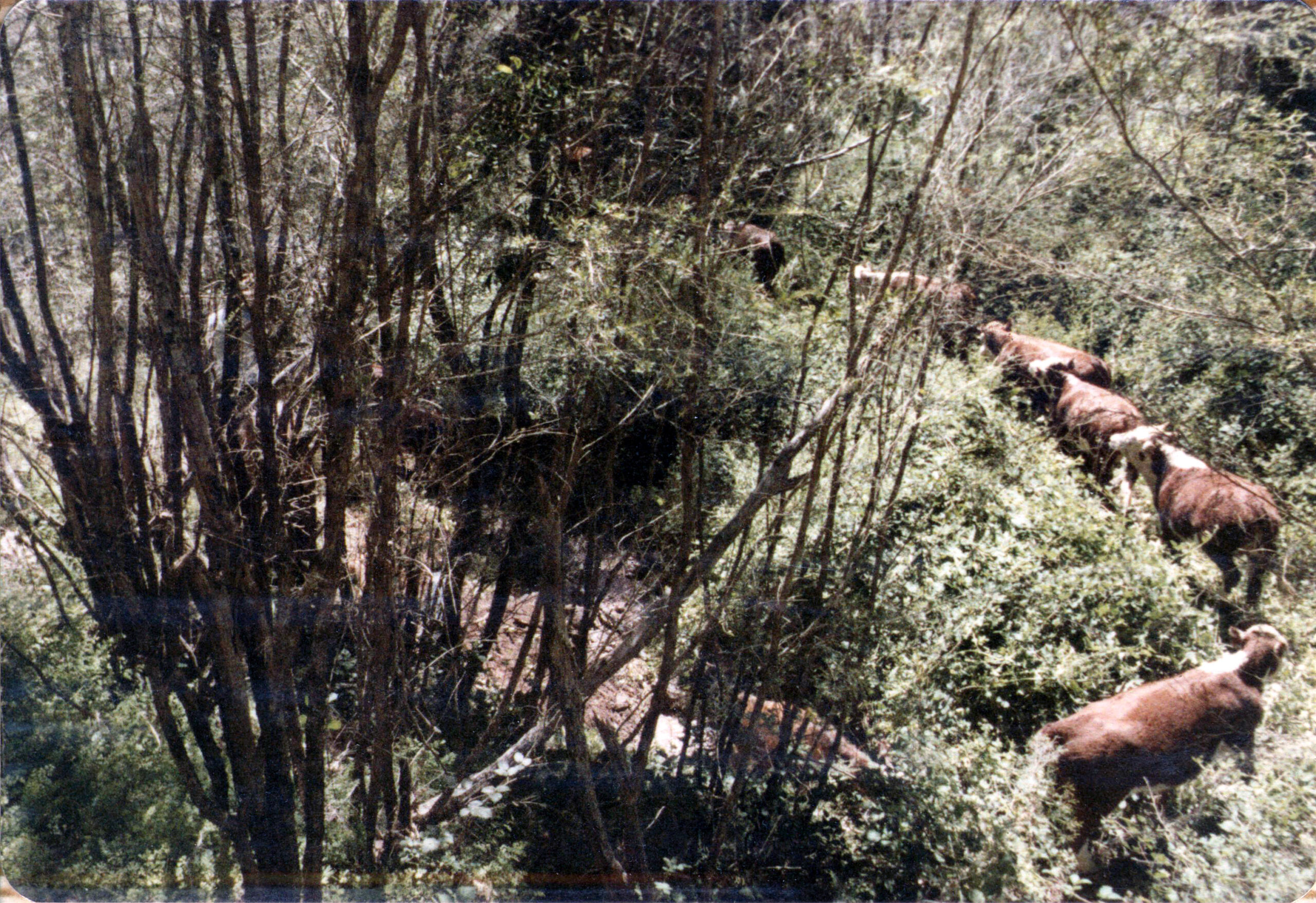 Dick Forrest and Peter Purcell, in partnership, taking cattle into Mitchells Creek for summer grazing (On the narrow Bridle Track) up the Jamieson River 1978-1980. Commentary by Dick Forrest: Cattle winding around a bend on Bridle Track. Blackberries on both sides of bend