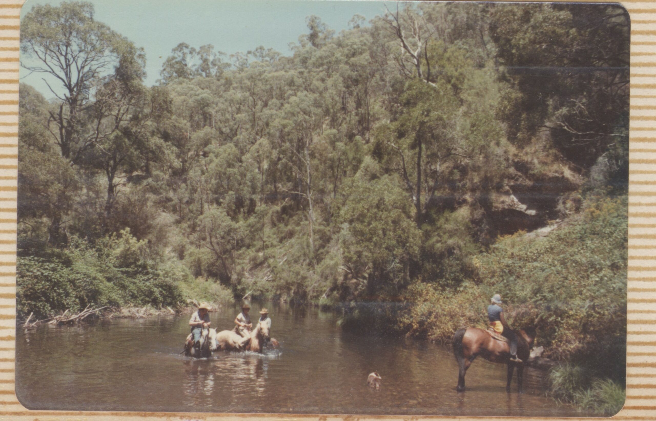 Dick Forrest and Peter Purcell, in partnership, taking cattle into Mitchells Creek for summer grazing (On the narrow Bridle Track) up the Jamieson River 1978-1980. Commentary by Dick Forrest: Peter Purcell, Jeanie Ackoster, Greg Purcell, Kate Burr. Horses and dogs cooling off in the Jamieson River