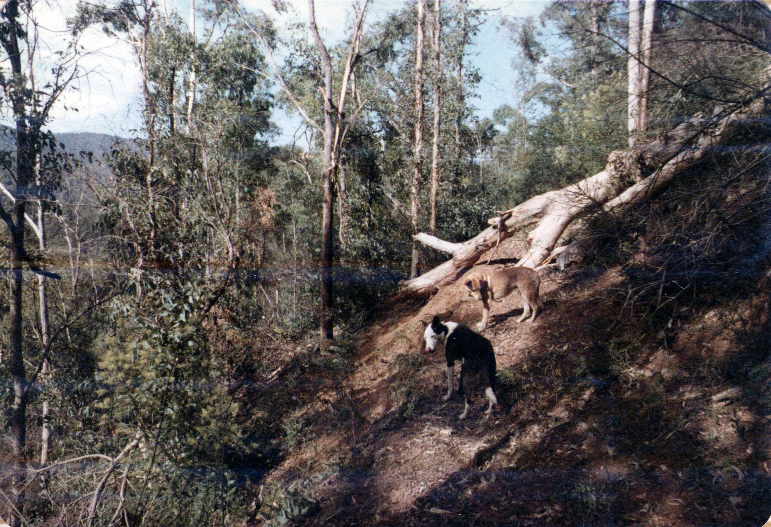Dick Forrest and Peter Purcell, in partnership, taking cattle into Mitchells Creek for summer grazing (On the narrow Bridle Track) up the Jamieson River 1978-1980. Commentary by Dick Forrest: Large tree fallen over Bridle Track this steered the cattle down a steep bank we had to get off the horses and rundown on foot as it was too rough and steep for horses and force the cattle back up onto the Bridle Track. We used to go in 2 weeks before we took the cattle up and keep the bridle track open but sometimes trees like this come down or bushwalkers up ahead could frighten the cattle off the track. The cattle were always very settled and tried to do the right thing for us once we had a few kms behind us.
