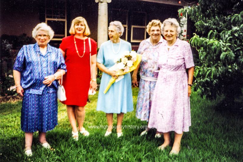 Ena Veal’s 80th Birthday afternoon at ‘Barjarg Station’, Pat & Tes Forrest’s homestead. Birthday 17th January, 1998. Taken 18th January. L-R; Ada Cleeland, Dianne Eames (Ena’s niece), Ena Veal, Enid O’Brien, Pat Forrest.
