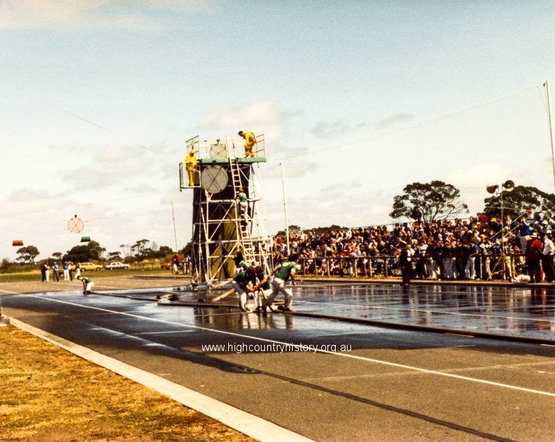The Y Sixes. Climb ladder, with hose to top of the Tower Stand. From the top squirt at target. Portarlington.