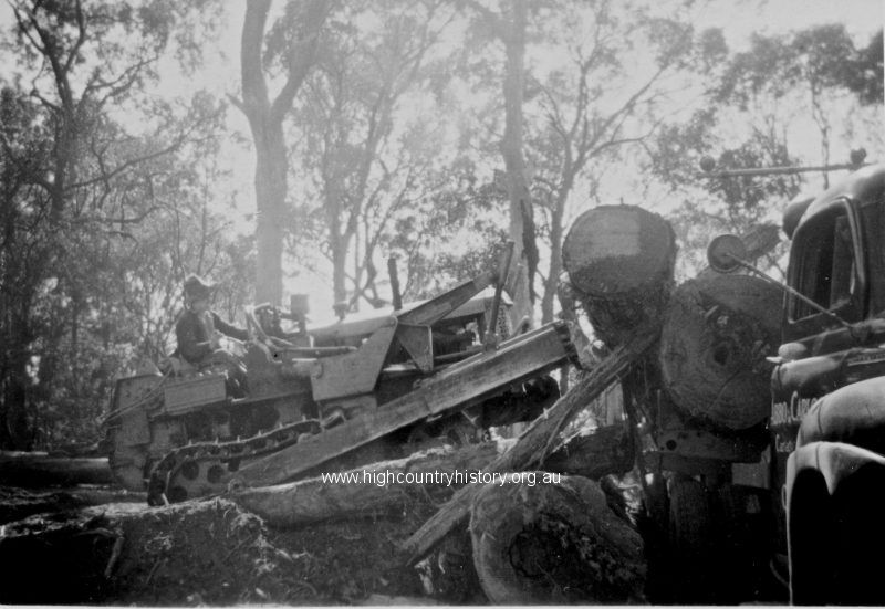 Forestry Commission – Mt Stirling Road. Loading logs the hard way during the 1940s.