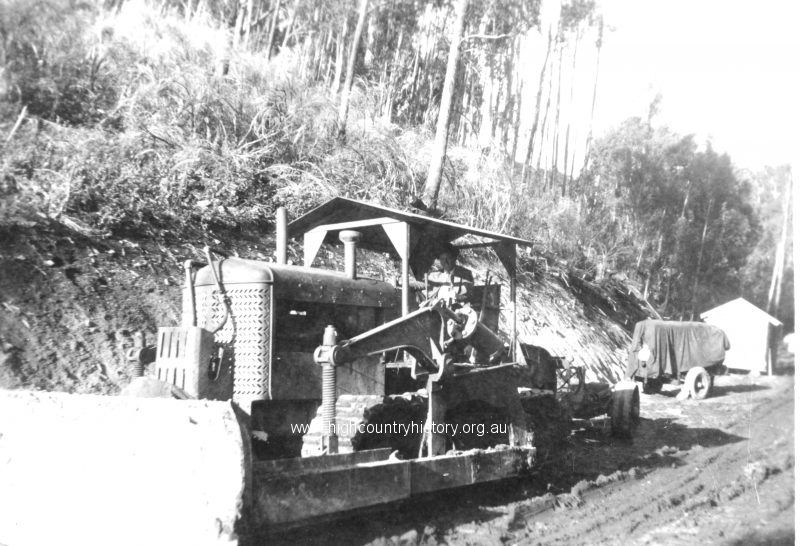 Forestry Commission – Mt Stirling Road. Workmen’s hut and compressor in rear of photo. Cletrac dozer at the front. Len Argent was the contractor.