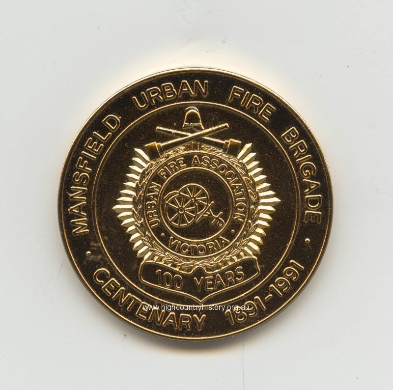 Medallion to honour 100 years service. Front of medallion awarded to all members of the Mansfield Urban Fire Brigade on the occasion of the Centenary Celebrations. This one belongs to Ex Captain Neil Gardiner.