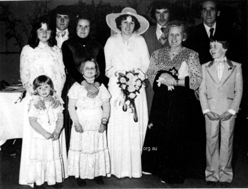 Gail Desmond’s (Klingsporn) wedding – 13 October 1979. Wedding party: Standing at back from left: John Klingsporn, Colin Klingsporn, Jack (father) Klingsporn. Middle row from left: Pauline Klingsporn, Julie Maroney, Gail Kilingsporn (Desmond), Irene Klingsporn (mother) David Klingsporn. In front from left: Michelle Maroney, Lisa Maroney.