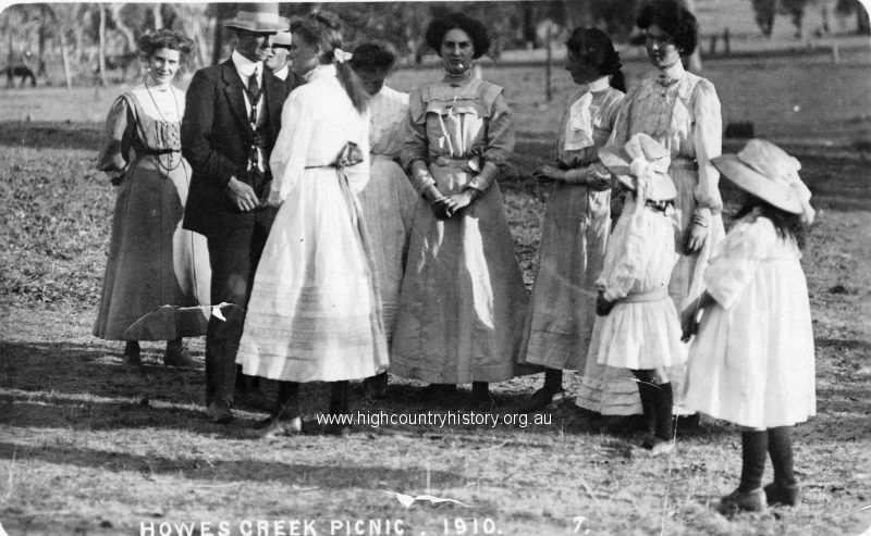 3 images. Howes Creek Picnic. Sarah Sussanah Allan Walsh (Aunty Doll) is the third from the left (lady in white dress, ponytail and white bow in hair). Aunty Doll – written on back of card. Sarah about 22 years of age in this photograph. She never married as it was customary at the time for the first-born daughter to look after parents and brothers. (Sarah was the only daughter – she had six brothers.)