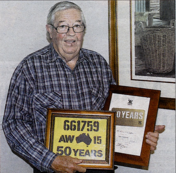 Jock Christopher with his certificate and commemorative stencil to recognise 50 years registration as a wool classer.