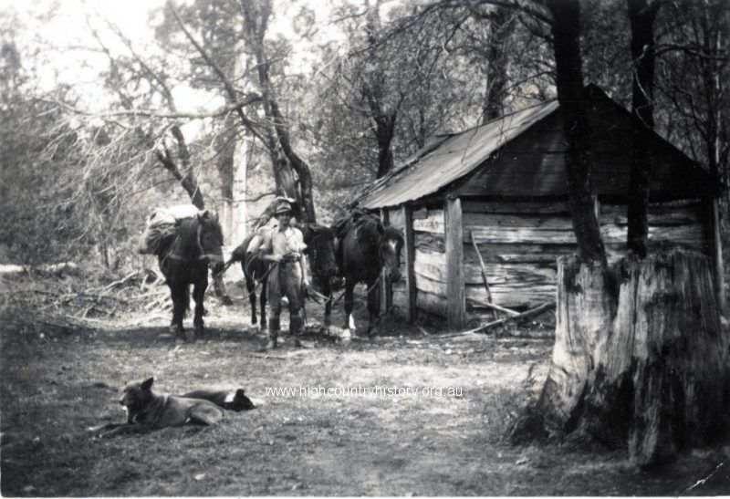 John Colwell Bullock. Photograph taken after 1939 bush fires as he was checking his hut – remainder of hut after fires. King River.