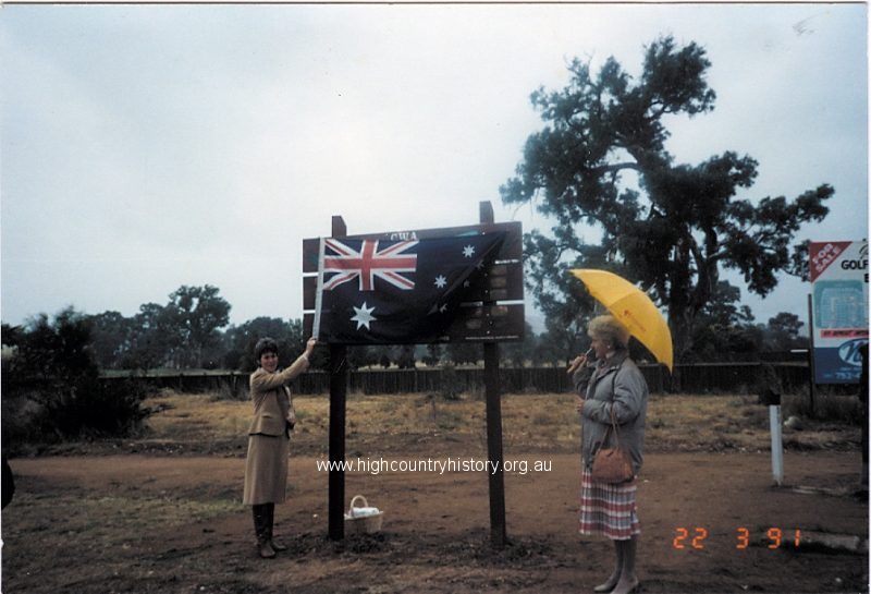 Mansfield Historical Society Secretary, Rita D’Arcy, watching Shire President, Anne Bell, commence to unveil the CWA Centenary Avenue of Poplars sign, on Melbourne/Mansfield Road. 22/03/1991