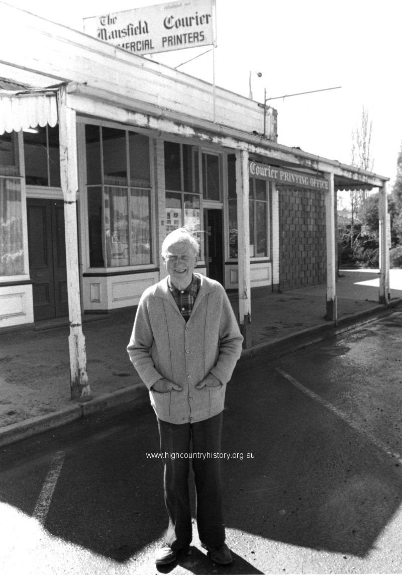 Les Amor (1903 – 1996), the Courier proprietor, standing in front of the Mansfield Courier office in High Street, Mansfield (eastern end). Les spent 70 years writing for the Courier.