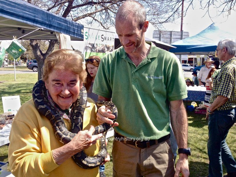 Mansfield Farmer’s Market. “Snake Smart”. Dave Wilkinson, introducing Muscles, his Darwin Carpet Python, who is approximately 5 years of age, to Maureen Davies, on the Medium Strip, at the Western end of High Street, Mansfield. Dave Wilkinson is Maureen Davies cousin.