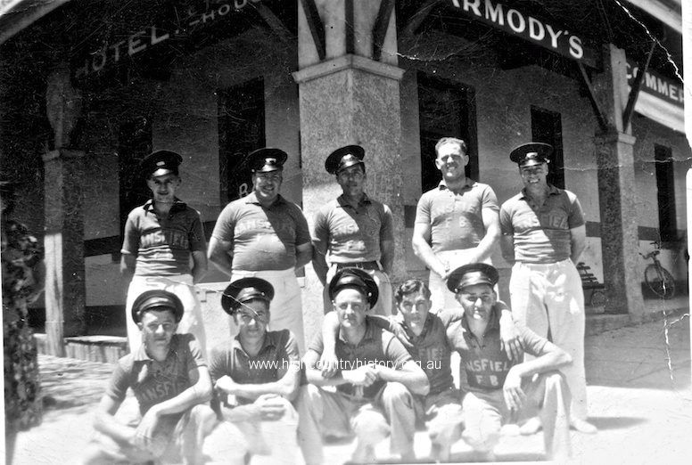 Mansfield Fire Brigade members in front of Ron and Fred Darmody’s Commercial Hotel, Alexandra. Back; L to R; Arthur Lamb, Len Parsons, Gordon McMillan, Ted Maloney (Policeman), Bill Parsons Front; Billy Heathcote, Bob Greenway, Keith Greenway, Billy Hogarth, Ian McColl
