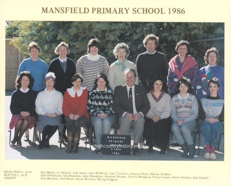 Mansfield Primary School – 1986 – Staff. Back Row L to R: Dot Marks, Di Zaviska, Judi Jacka, Joan McMillan, Lew Trenkner, Jocelyn Brain, Marian Chalker. Seated L to R: Gail O’Halloran, Ula Sheather, Jane Woodman, Annette Morgan, Neville Melgaard, Cheryl Lester, Helen Hookey, Sue Cooper. Absent: Ken Sheather, Sid Revell, Bruce McInnes, Morag Huggins.