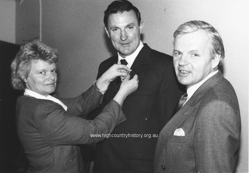 Superintendent Bruce Bingham, recipient of the Red Cross Award, to acknowledge his work over the years for Red Cross and DISPLAN, the State’s disaster plan. Marlene, his wife, is pinning on his Red Cross avard watched by the Executive Director of the Victorian Division.