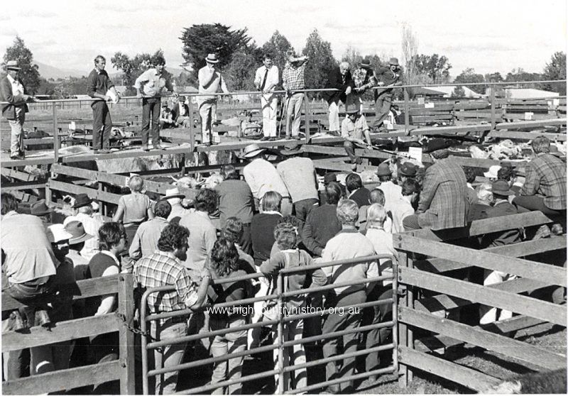 Mansfield stock sale yards – cattle sales. (Three views) Also see VMHSP1636a (same as VMHSP0133) and VMHSP1636b (same as VMHSP3700) – facing the crowd: John Ash and Brian Rodwell in centre; third from left – Stephen Purcell (Gippsland and Northern Co); fifth from left – Lindsay Mathieson; third from right hand end – Jack Purcell.