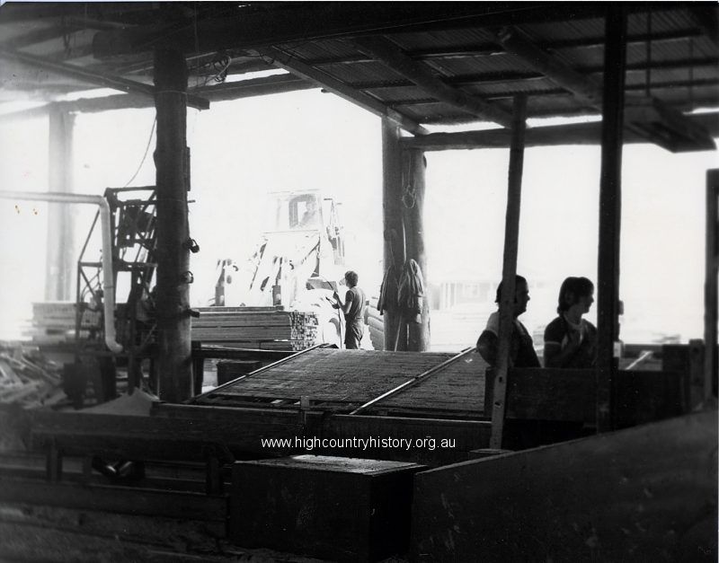 Marbut-Gunnersen Sawmill. Looking from centre of mill out. Shows water conveyer in foreground and rear of docking saw on left, with timber stacking area in background. Chris Mahony and Frank Bailey on right, Les Fletcher in background.