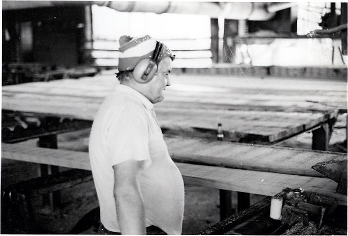 Marbut-Gunnersen Sawmill. V. Long. Leverman on 4-man bench. Also shows slabs from breaking down ready for re-sawing.