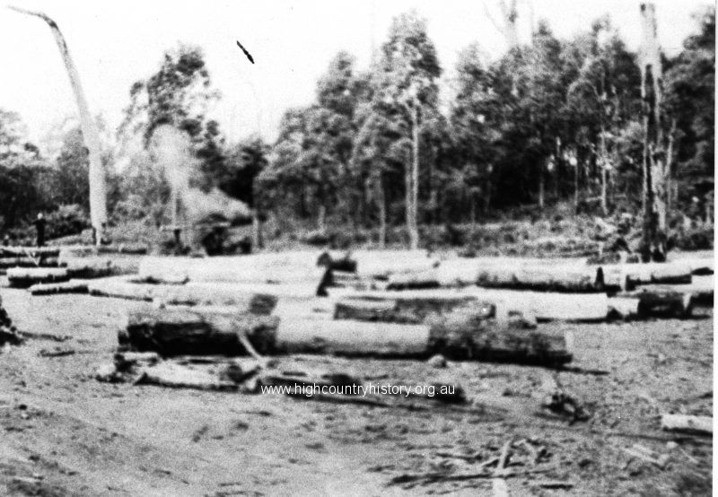 Messmate logs at Dick’s Landing. Traction engine in background. Dick Rodda standing on log.