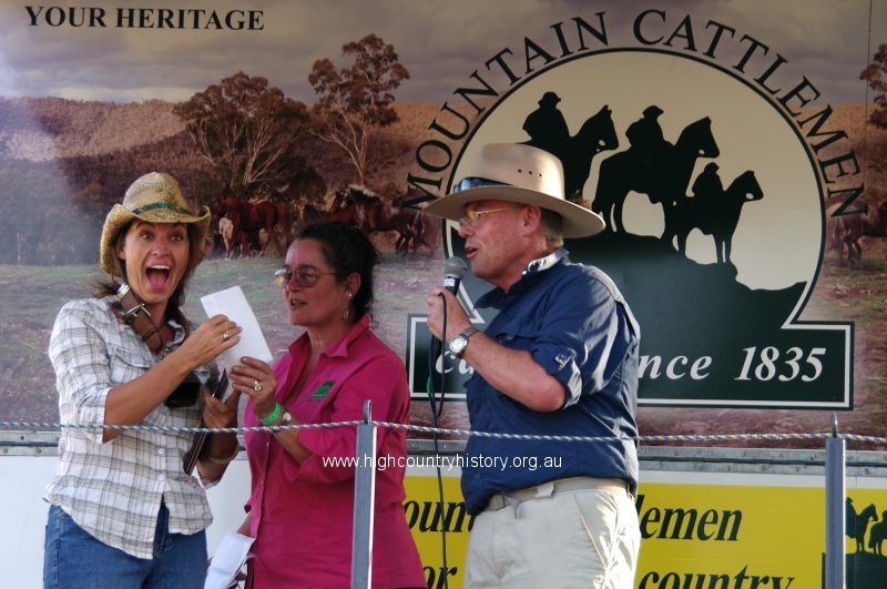 MOUNTAIN CATTLEMEN’S ANNUAL GET TOGETHER WOMBAT CROSSING 2010. WINNER OF DON KNEEBONE PRIZE SONIA BUCKLEY BEING PRESENTED WITH AWARD FROM WENDY STONEY AND PHILIP DAVIS