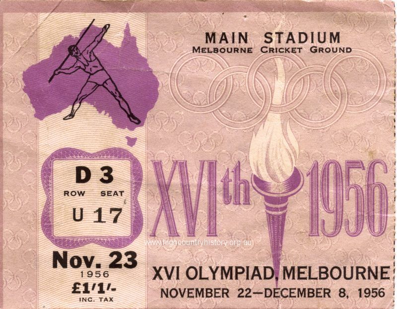 Olympic Games Ticket 1956 Games – XVI Olympiad Melbourne. Main Stadium. Melbourne Cricket Ground. Students from Mansfield Higher Elementary School travelled by train to Melbourne to attend the games. We had to wear our school tunics. It was a very warm spring day and we were all sunburnt.