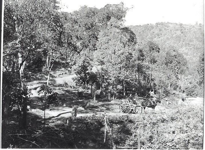 Phillip Merlo in horse and jinker at the Devil’s Elbow – U.Turn Creek Road, Alexandra side of The Gap. (Now Haine’s saddle – formerly Hell’s Gap.)