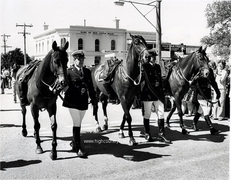 Three riderless horses with black shrouds and boots draped over their saddles, are led from the memorial dedicated to the three policemen killed by the Kelly gang near Mansfield 100 years ago.