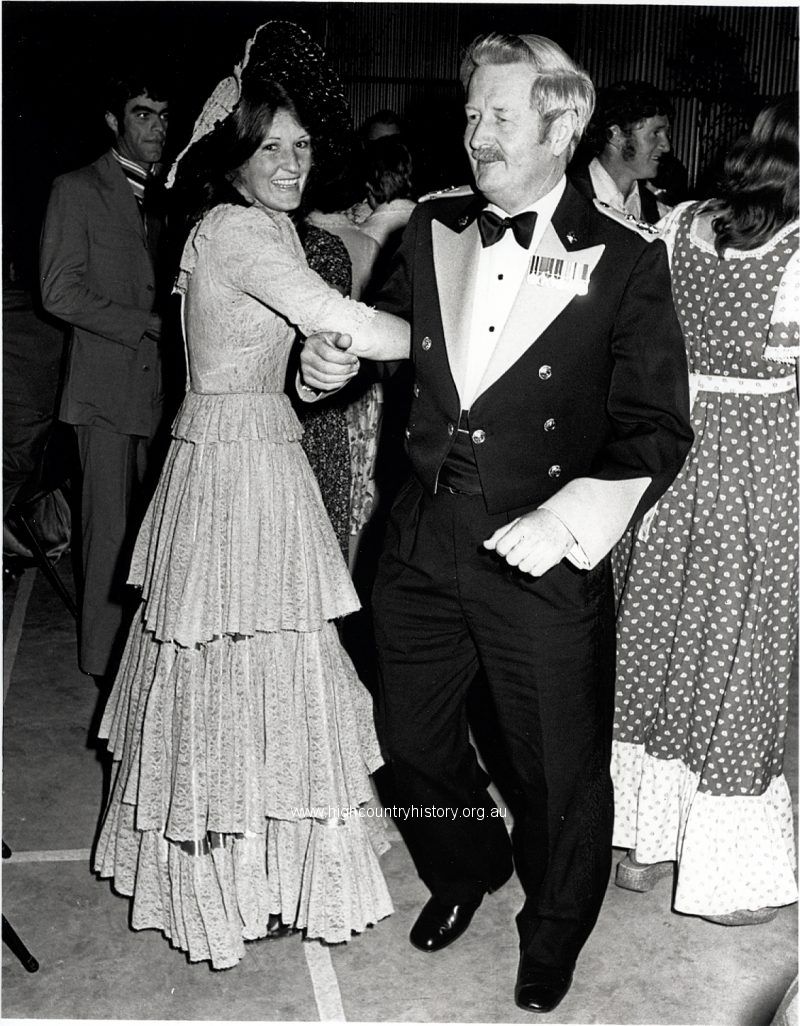 Acting Police Commissioner Salisbury dances with Janice Cox, 19, of Mansfield, at the ball. Mr Salisbury was one of about 150 police who went to Mansfield for the Memorial Service. The ball was held in Lloydie Parks’ wool/hay shed.