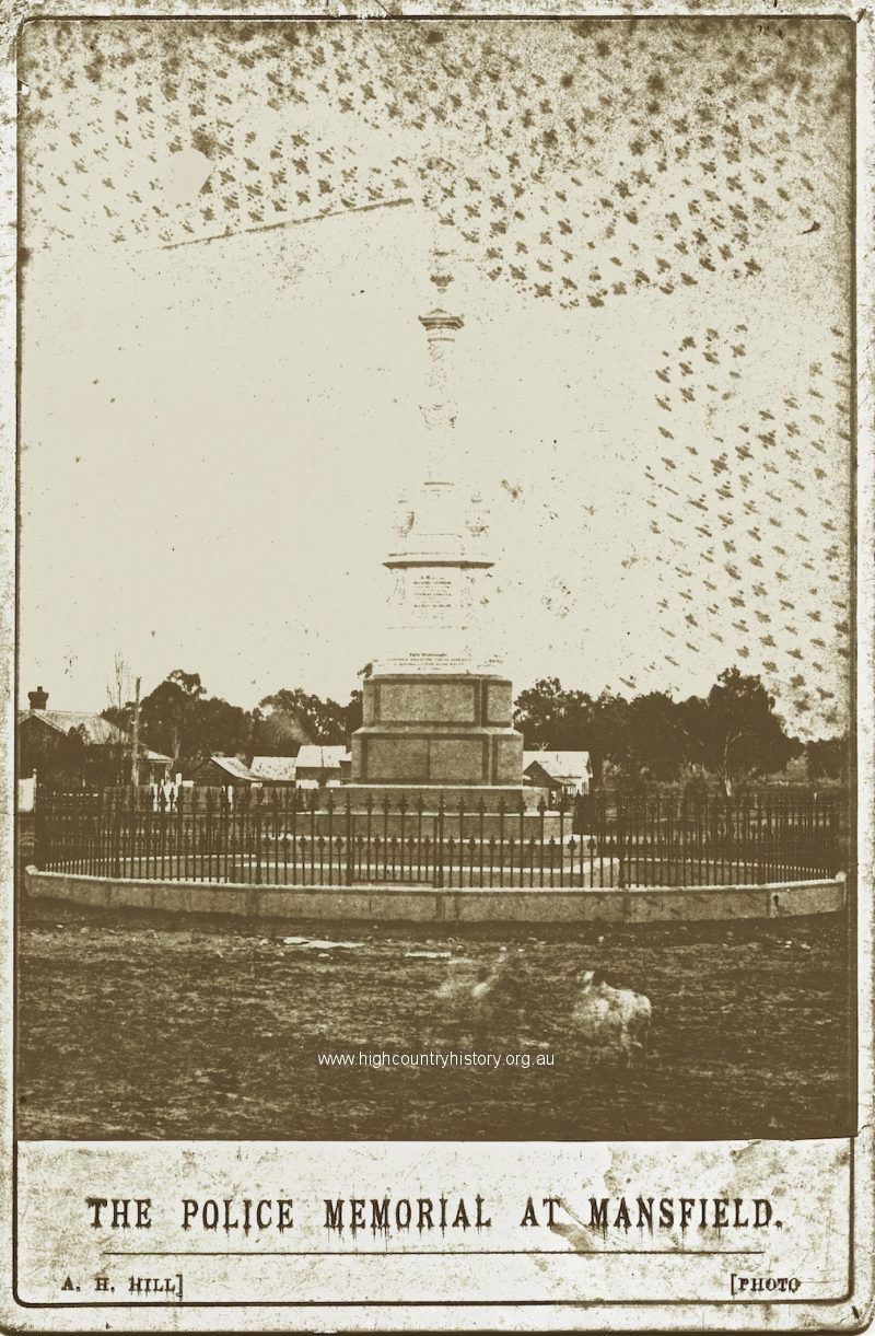 3 images. The Police Memorial at Mansfield – On back is printed the speech delivered on the occasion of unveiling the Monument by Captain Standish Chief Commissioner of Police on the 22nd of April 1880. (Same item as VMHSP0594)