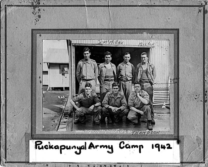 In front of the cookhouse. WW2. Back; L to R; ? , Cyril (Gordon) McMillan, ? , Milton. Front; ? , ? , Thompson. McMillan and Milton were the only two cooks in the photo.