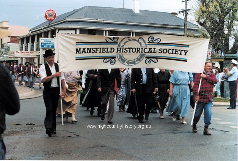 Railway Centenary Re- Enactment 1891-1991. Mansfield Historical Society banner carried by Bernie Anstee and unknown person. They are walking along High Street past the Mansfield Hotel. The Rose City Band is in front of the Mansfield Hotel.