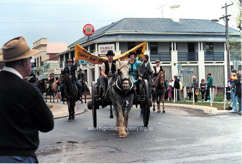 Railway Centenary Re- Enactment 1891-1991. Bernie McWhinney and Jocelyn Lovick in Bernie’s dray followed by the Mountain Cattlemen. Building L-R: National Australia Bank, Blunt’s Drapery and Mansfield Hotel.