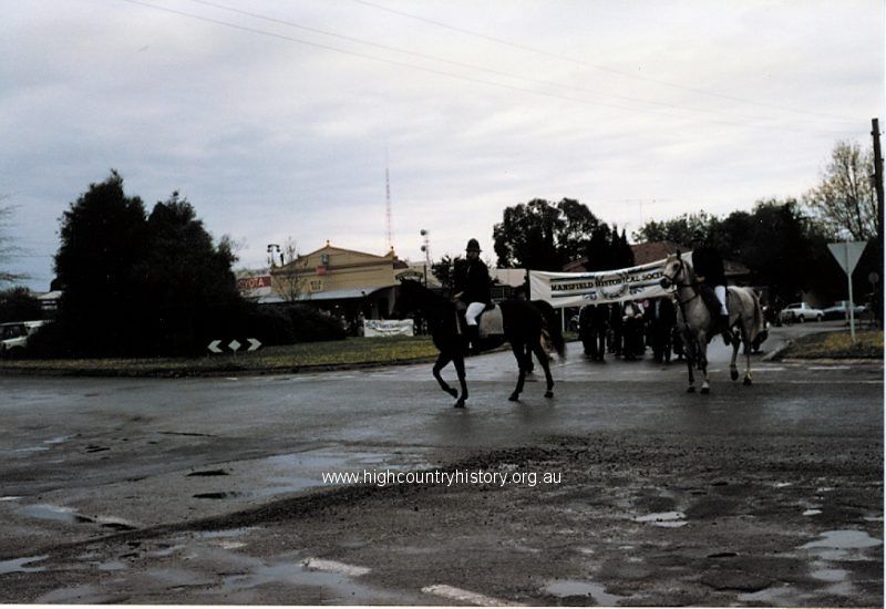 Railway Centenary Re- Enactment 1891-1991. Mounted police, Brendan Leach and Chris Jenkins followed by the Mansfield Historical Society members. Buildings: Max Brown Toyota, Country Milk Bar, Backpackers Inn and Mike Davidson’s residence.