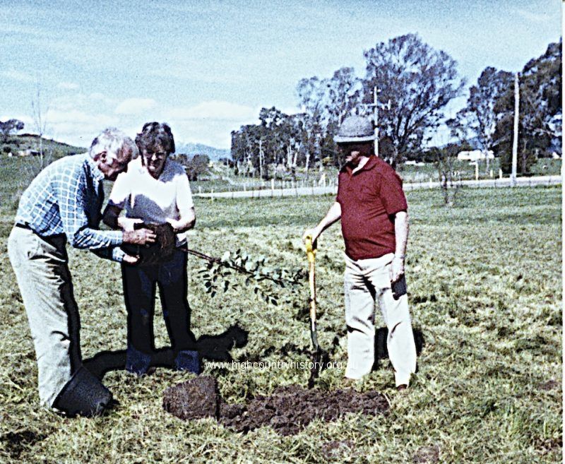 Celebrating 75 years Red Cross in Australia and 50 years of Red Cross service by local Mansfield branch members, at the Mansfield Botanic Gardens, 29 September 1989. John Fogarty, Shirley Matthew and Alec Matthew.