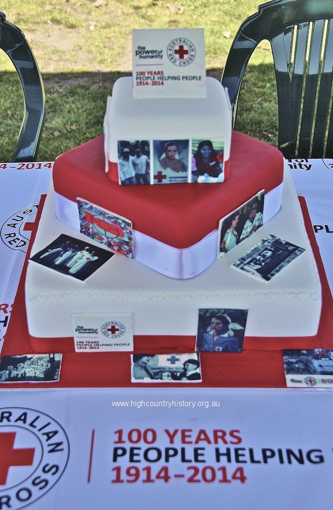 Red Cross Centenary (100 years) Celebration Cake made by April Curry. Dedication of the Mansfield Branch of Australian Red Cross, Centenary Rose Garden. Location Botanic Park, Mansfield