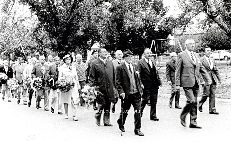Returned soldiers march to Memorial Memorial Gates, up Highett Street. Front row right to left: Perc Balding, Don Dick, Unknown, Pros Reid, Eric Pigdon, Unknown, Roy Bostock, John Buckland. Middle row right to left: Unknown, John Flynn, Harry Nix, Unknown, Unknown, maybe Jack Purcell. Back row right to left: Gordon McMillan, Freddie Jewell, Unknown, Unknown.