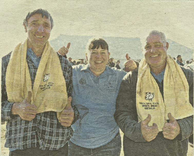 Shearers Hall of Fame- Hay – Sports Shear Australia. Thumbs up: machine shearer John Harris, wool handler, Maria Walsh and machine shearer, Jack (Ian) Mahoney, all of Mansfield.