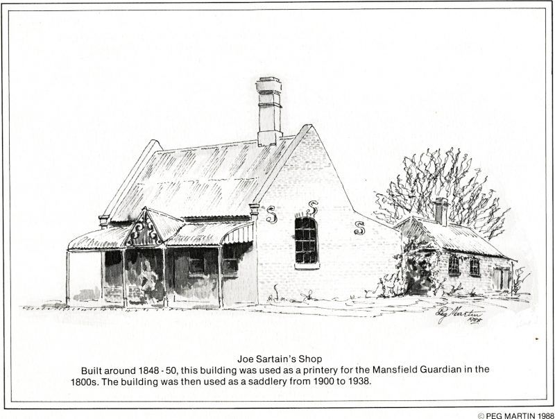 Jo Rartain’s Shop. Built around 1848-50, this building was used as a printery for the Mansfield Guardian in the 1800’s. The building was then used as a saddlery from 1900 to 1938.