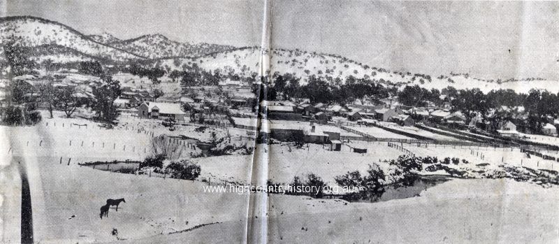 Snow scenes, Mansfield, 31st May, 1913. Overlooking Mansfield from Mill Paddock, off Baldry Street can be seen. Middle; Butter factory Left; Lighting plant- later S.E.C.