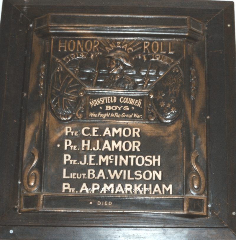 The Honour Roll 1914 – 1918. ‘Mansfield Courier Boys’ who fought in the Great War. The Amor Honour Roll, which always hung in the Courier office. After the Amors sold the Mansfield Courier the Honour Board was donated to the Mansfield Historical Society.
